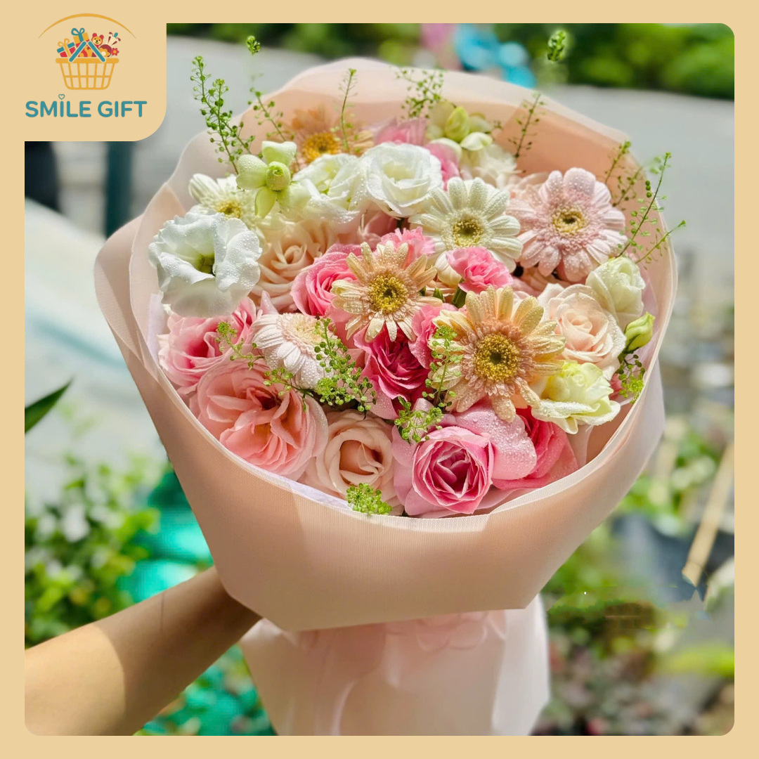 Loại hoa chính: Sự kết hợp tinh tế giữa hoa hồng (tượng trưng cho tình cảm chân thành), hoa đồng tiền (biểu tượng của sự may mắn, tài lộc) và hoa cát tường (lời chúc vạn sự như ý).